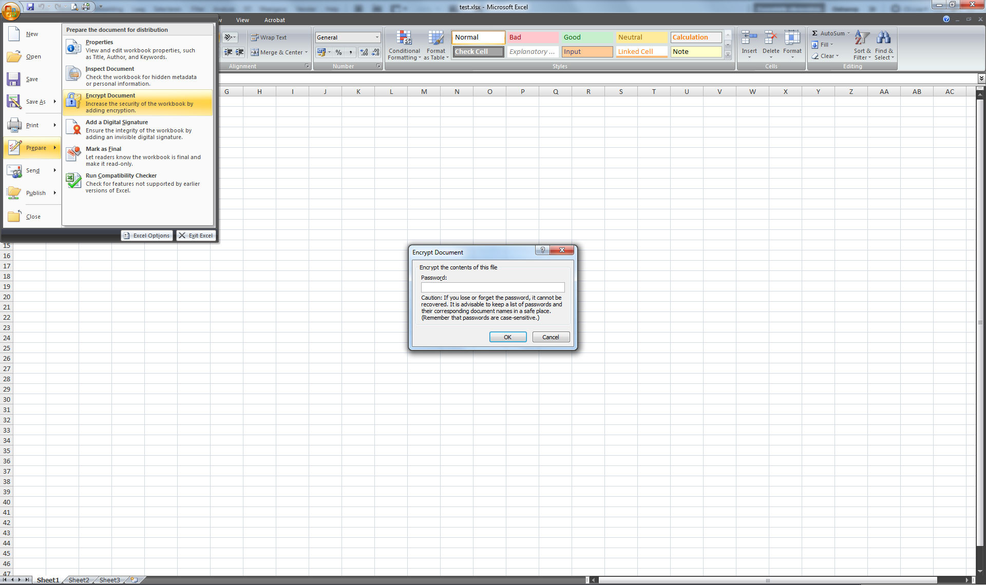 Zowel in Excel2007 als Office365 is het beveiligen van uw excelsheet eenvoudig. In Excel2007 klikt u op het Windows logo in de linkerbovenhoek en zoekt naar prepare. Zo kan u dan uw dowument voorzien van een paswoord.